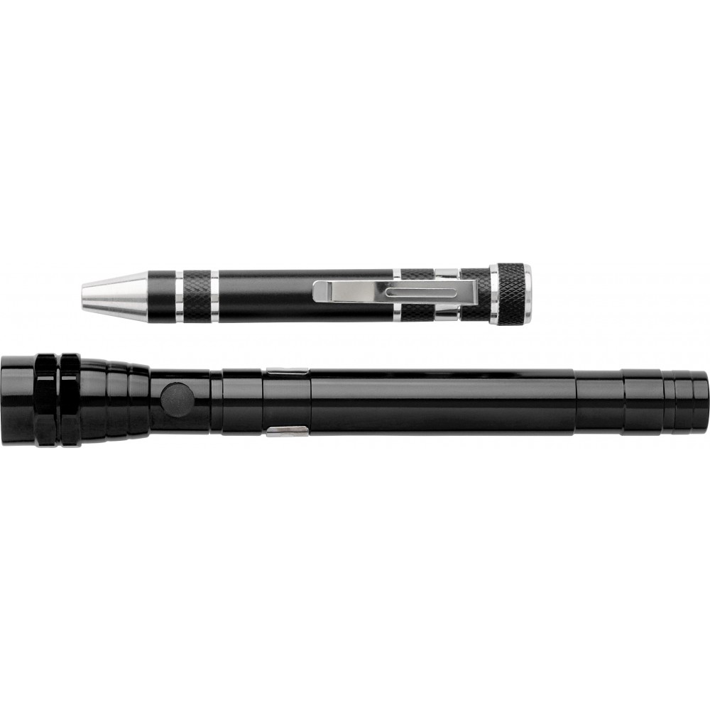 Set lanterna telescopica si surubelnita in forma de pix cu patru capete plate si patru capete in cruce. Ambalata in cutie de cadou neagra.