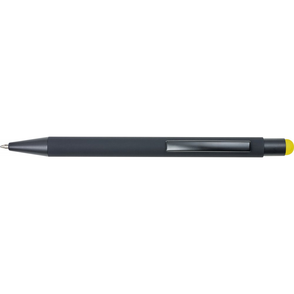 Pix metalic cu invelis de cauciuc si varf touch. Corp negru, iar imprimarea va fi colorata. Mina albastra. Personalizare recomandata: gravura laser, imprimare UV.