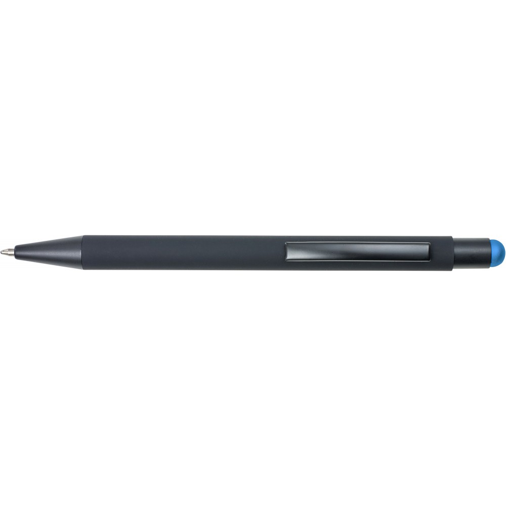 Pix metalic cu invelis de cauciuc si varf touch. Corp negru, iar imprimarea va fi colorata. Mina albastra. Personalizare recomandata: gravura laser, imprimare UV.