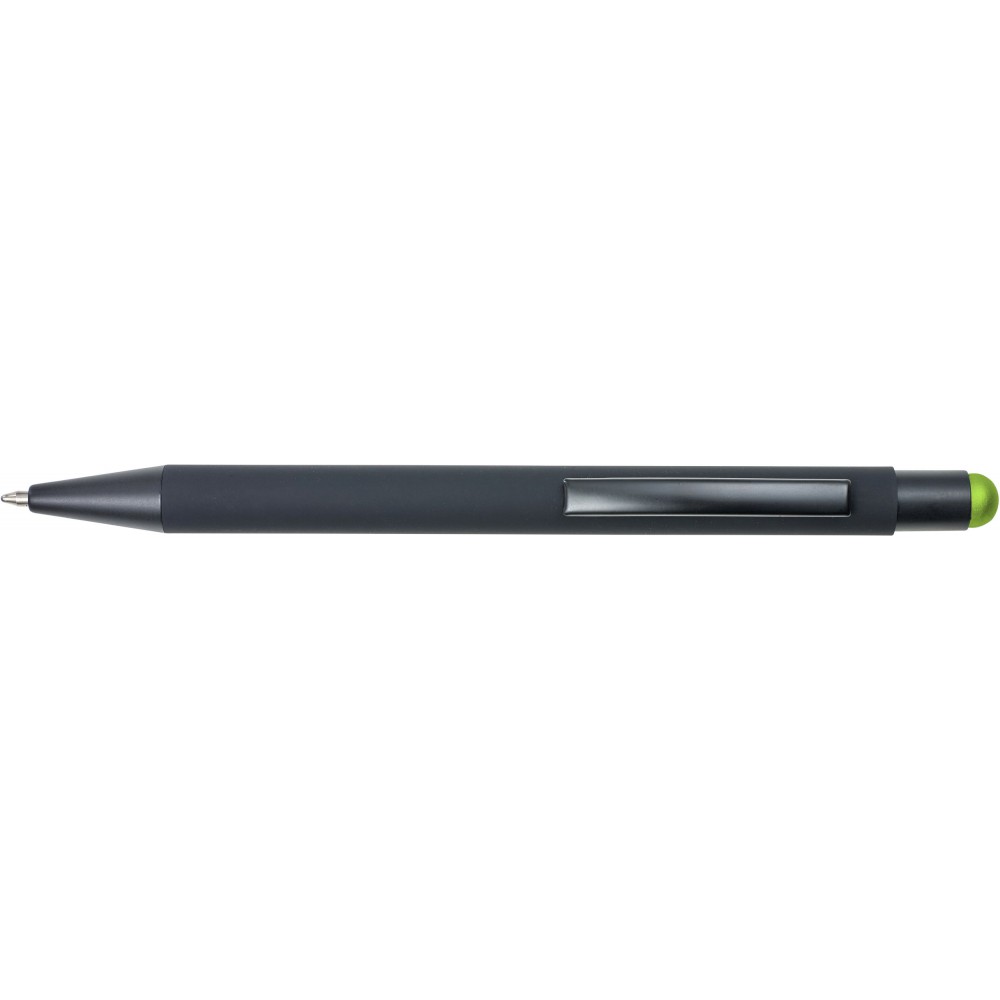 Pix metalic cu invelis de cauciuc si varf touch. Corp negru, iar imprimarea va fi colorata. Mina albastra. Personalizare recomandata: gravura laser, imprimare UV.