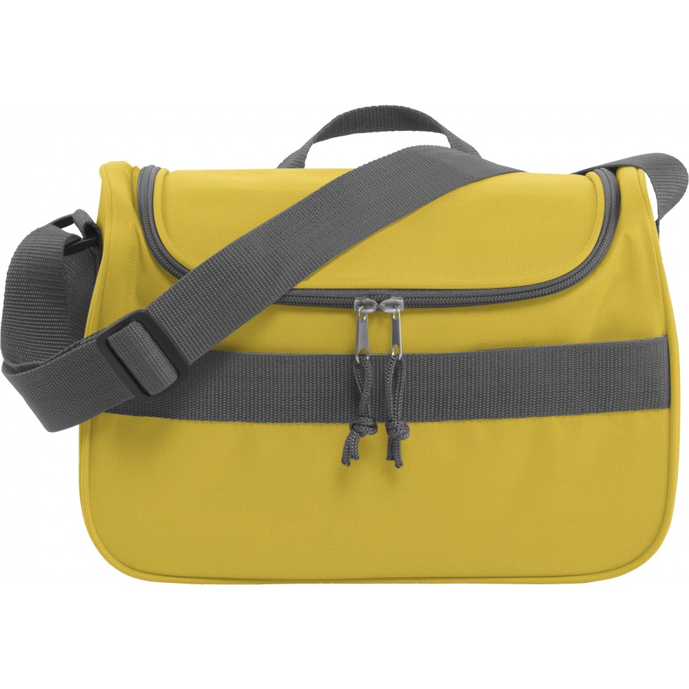 Polyester (600D) cooling bag with a front pocket with Velcro closing, one large compartment, a carry handle, and a adjustable carry strap.