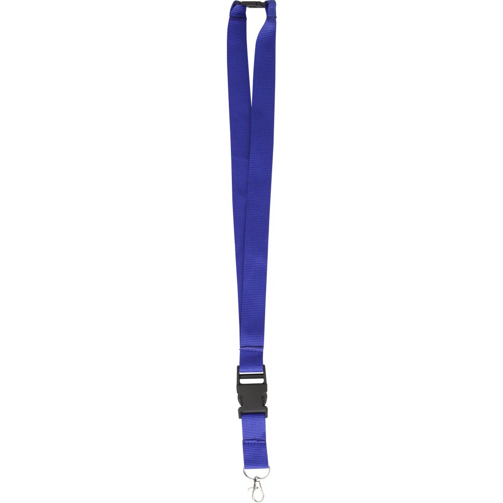 Polyester lanyard with plastic safety release clip and metal key holder.