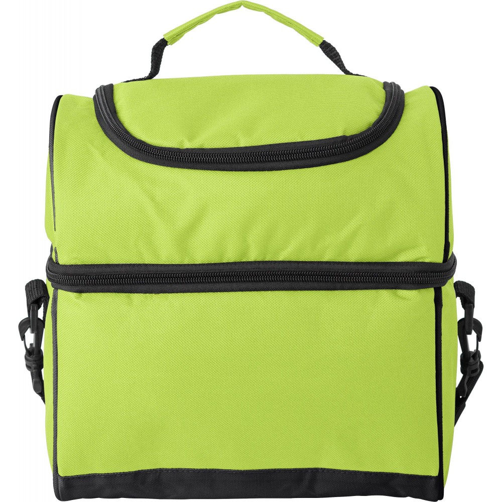 Polyester (600D) cooler bag with PEVA lining on the interior. Extra compartment on top of the lid. The strap is adjustable.