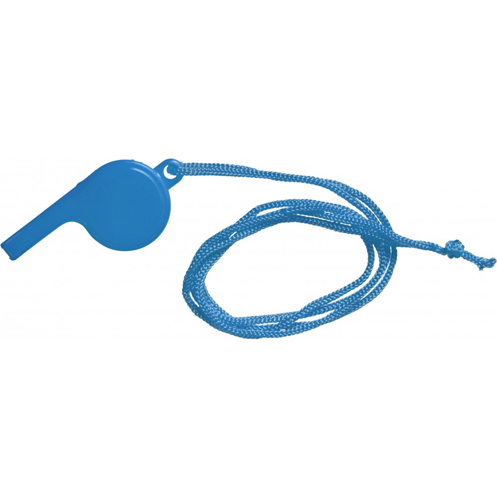 Fluier plastic; snur pentru gat. Se vinde in cutie de 48 buc.