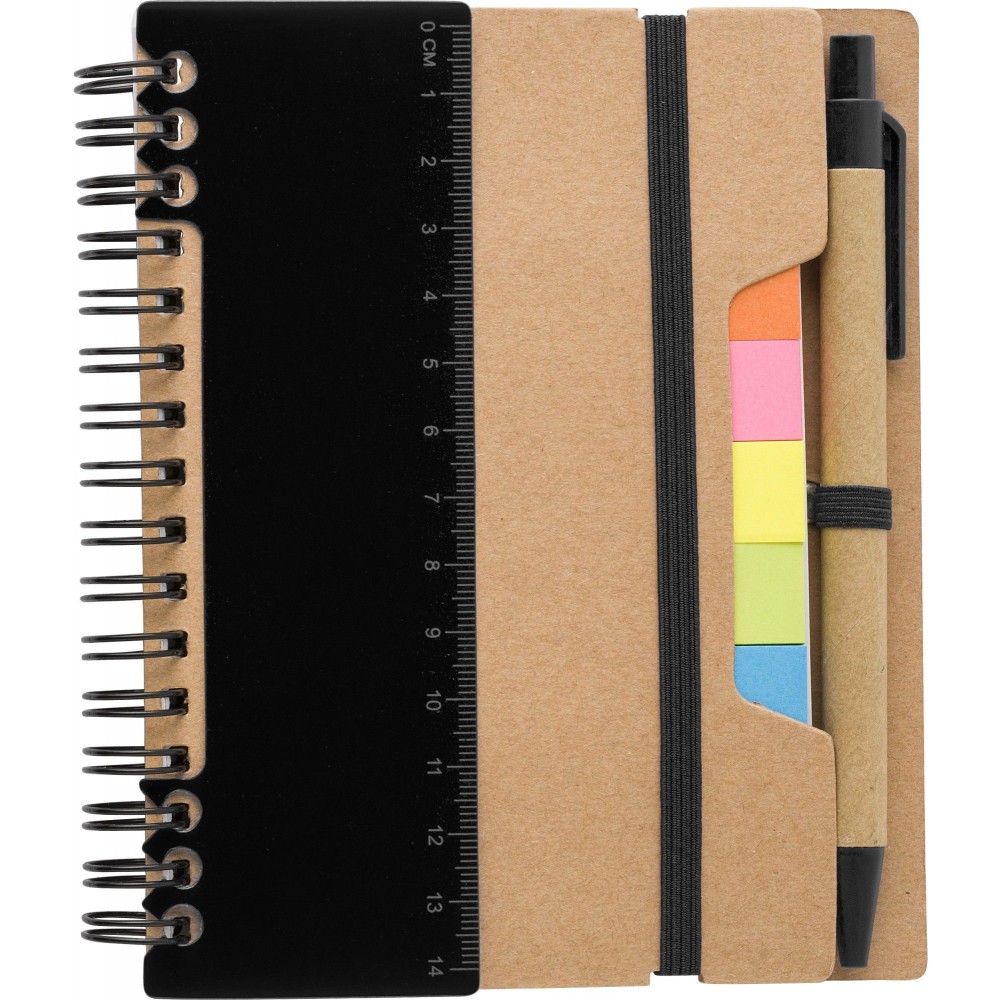 Recycled paper, wire bound notebook with 60 lined pages, ruler, and ballpen with blue ink. 5 Colours of sticky notes, 25 sheets per colour.