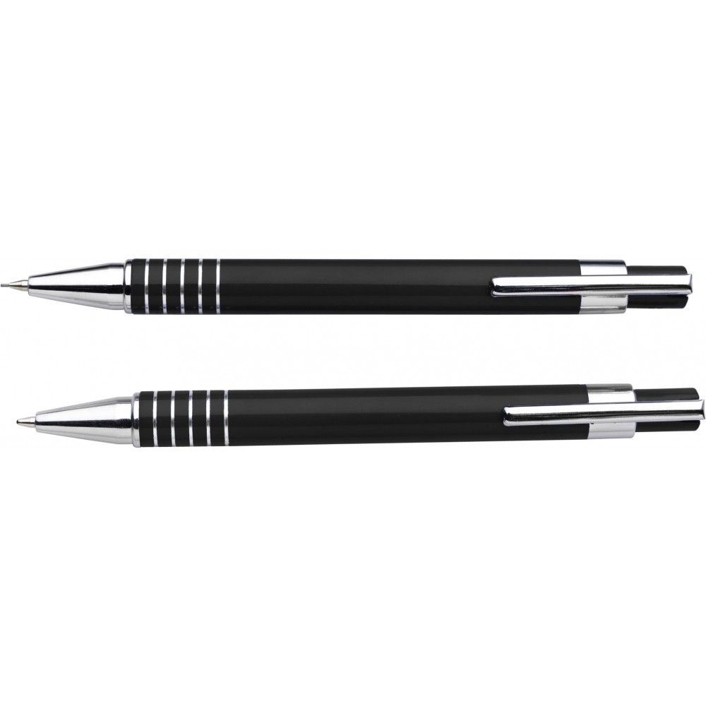 Aluminium writing set consisting of a lacquered ballpen with black ink and a mechanical pencil. Packaged in a metal pen case. Provided with German Dokumental Ink.
