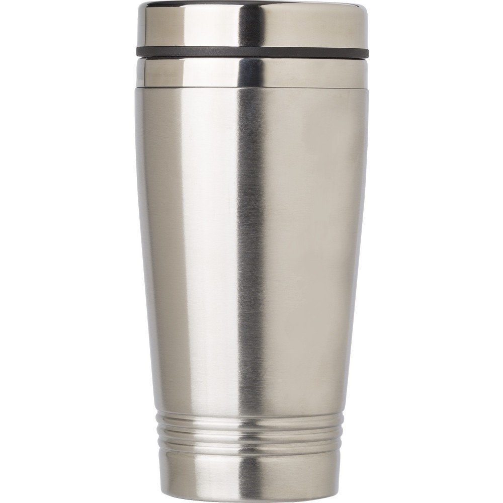 Stainless steel drinking mug (450 ml) with lid, double walled. Lid has a sliding opening for drinking. Anti-slip bottom. Individually packaged in a brown cardboard box.