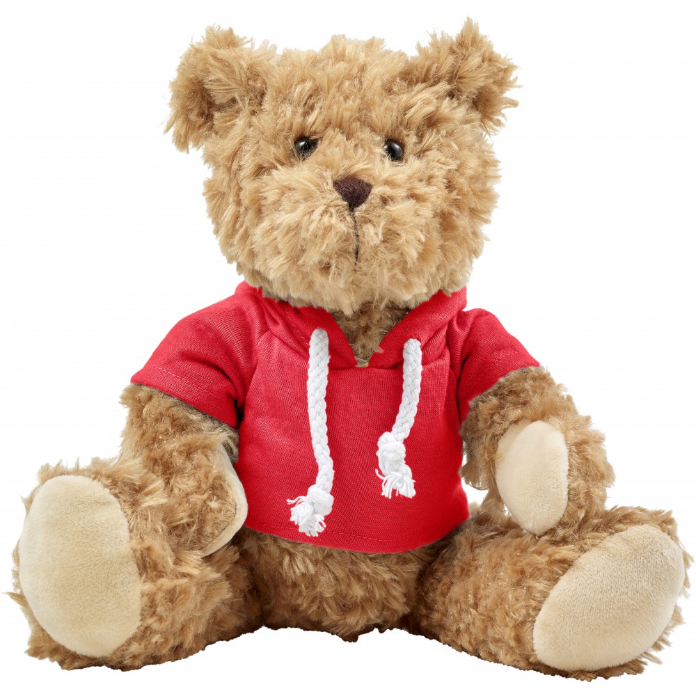 Plush teddy bear with hoodie and stitched eyes.
